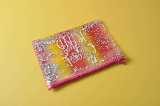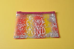 Looking for a pouch to make a wonderful journey with you? Shake things up with the "Be Cool And Kind" Liquid Glitter Pouch and let it inspire all your thoughts and dreams. The unique water and glitter-filled cover are truly eye-catching.
